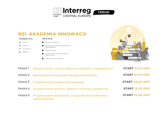Dziś, po wielu miesiącach wytężonej pracy partnerów projektu CERUSI, udostępniamy nowo uruchomiony kurs on-line "RSI: Akademia Innowacji".