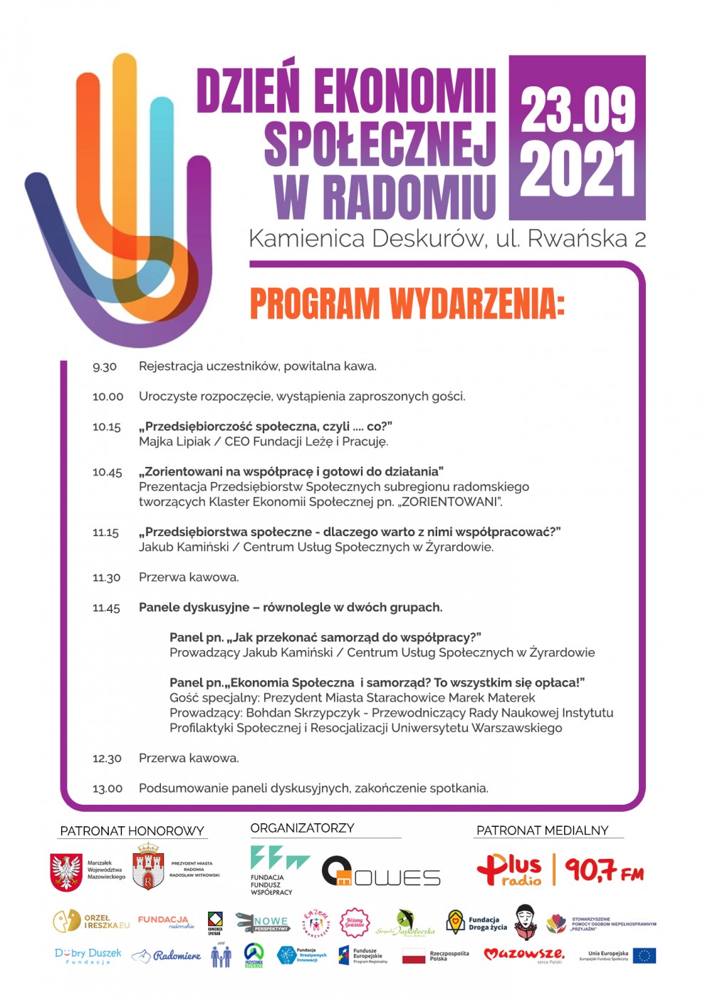 W ramach Dnia Ekonomii Społecznej ok. godz. 11:45 odbędą się także równolegle panele dyskusyjne z udziałem praktykantów ekonomii społecznej, a także ekspertów i przedstawicieli jednostek samorządu terytorialnego.