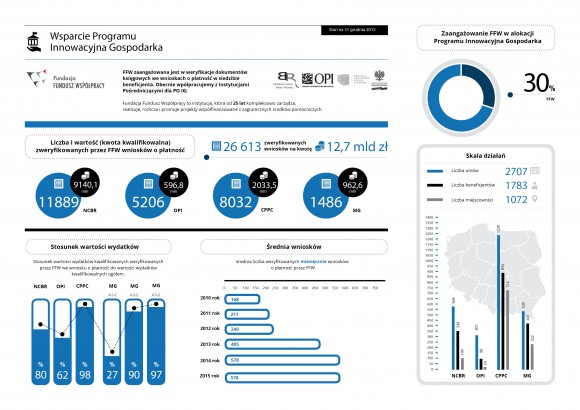 Pracownicy Biura Wsparcia Sektora Publicznego FFW, w ramach umów z Narodowym Centrum Badań i Rozwoju (NCBR), Ośrodek Przetwarzania Informacji (OPI), Centrum Projektów Polska Cyfrowa (CPPC) oraz Ministerstwem Gospodarki do końca 2015 roku zweryfikowali łącznie 26 613 wniosków o płatność, na łączną kwotę 12,7 miliardów złotych!
